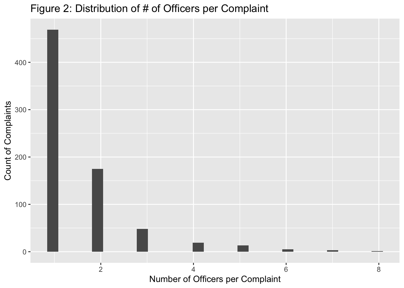 We’d also like to look at this topic from a complaints-based perspective: are civilians usually submitting complaints about a single officer’s behaviors or is it typically more than one officer on a single complaint? Our dataset contains a total of 733 complaints about officers on the provided rosters, some of which contain multiple officers on the same complaint. The average number of officers listed in a single complaint is 1.59, with the full distribution shown in Figure 2. This distribution is less skewed, but we see that although there are many complaints that only involve one officer, 36% of complaints contain more than one officer. Lastly, we want to give a preliminary sense of how officers are connected to other officers through co-complaint activity. To do this, we find that, on average, officers are connected to 3.26 other officers through co-complaints, or being names on the same complaint.